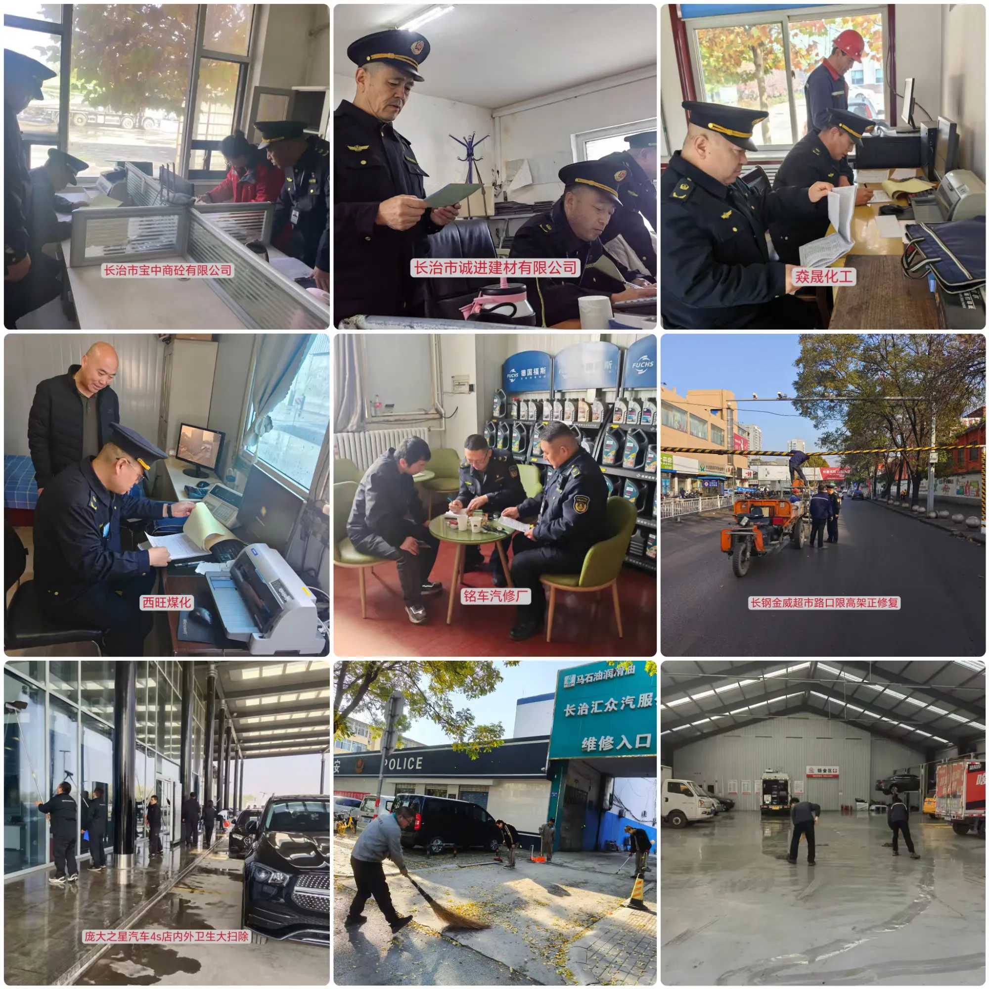 工作人员对辖区路段、源头企业进行日常巡查;在辖区维修企业处理投诉;督促汽修门店进行门前路面及建筑物清洗保洁。