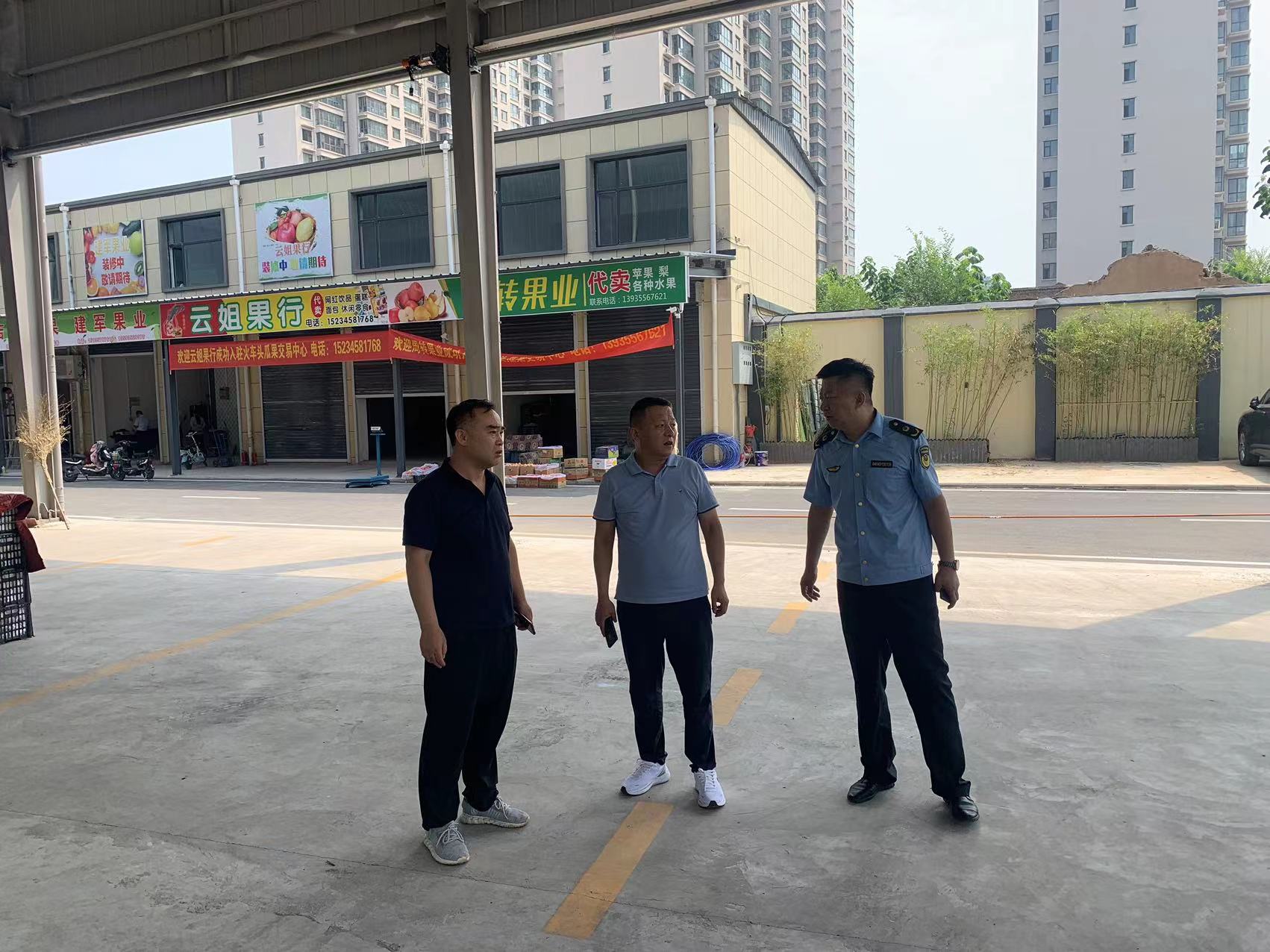 2023年8月15日,李湘江副局长带领西街市场所工作人员按照国家卫生城市复审标准对火车头瓜果交易中心信息公示、食品安全和价格公示等情况进行督察。