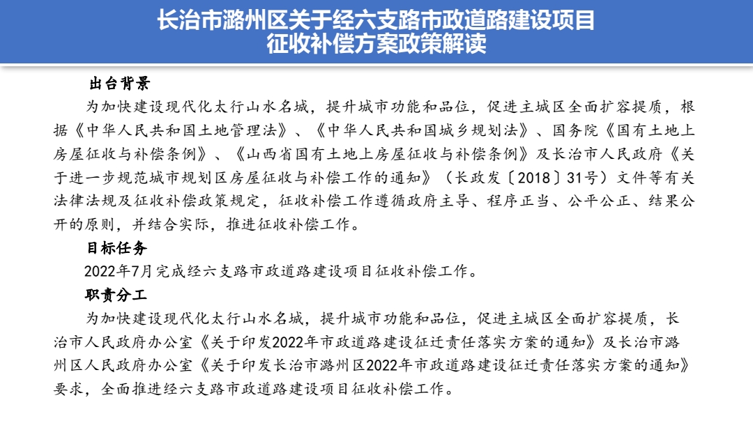 原文链接:长治市潞州区人民政府办公室关于印发经六支路市政道路建设项目征收补偿方案的通知